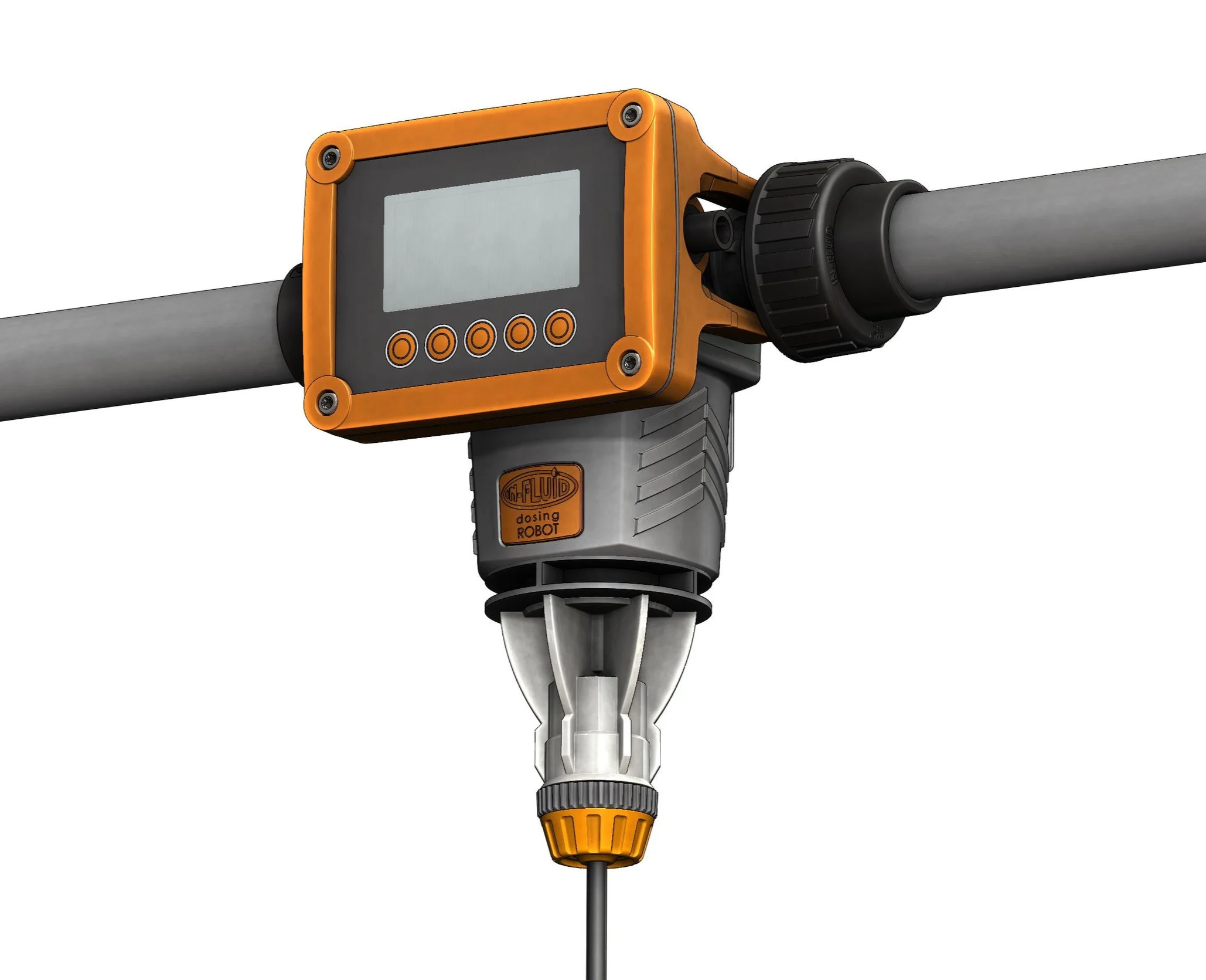 The “Compact Dosing Robot” is an advanced dosing system developed to register water flow and dose chemicals simultaneously with high precision. The device integrates seamlessly into a waterline, where an electronic flow sensor detects even very low flow rates starting from 100 mL per minute.